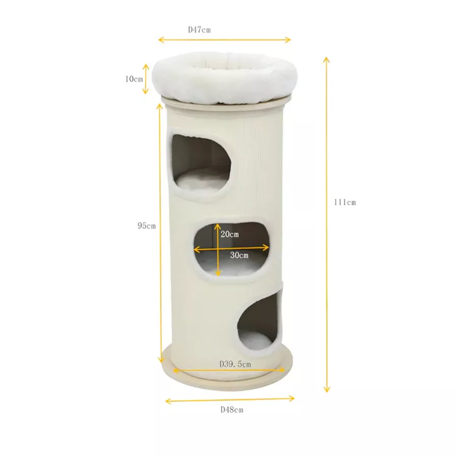 In den drei großzügigen Höhlen finden Samtpfoten jederzeit ein gemütliches Plätzchen zum Dösen. Die weichen Kissen sind herausnehmbar und waschbar, sodass Hygiene und Komfort dauerhaft gewährleistet sind. Dank der leicht zugänglichen Ebenen eignet sich der Tower auch hervorragend für ältere oder weniger mobile Katzen.