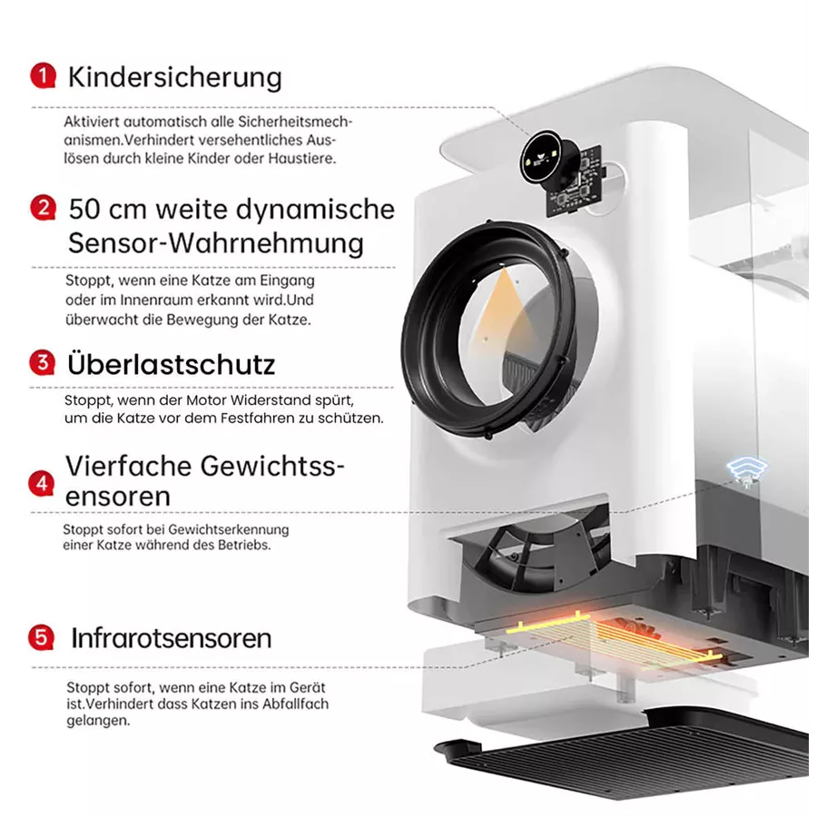 Was wirklich überzeugt, ist die durchdachte Technik des AstroPet Mercury. Dank integrierter Sensoren erkennt die Toilette sofort, wenn Deine Katze sich nähert oder darin aufhält. Der Reinigungsprozess stoppt dann augenblicklich – Sicherheit steht hier an erster Stelle.