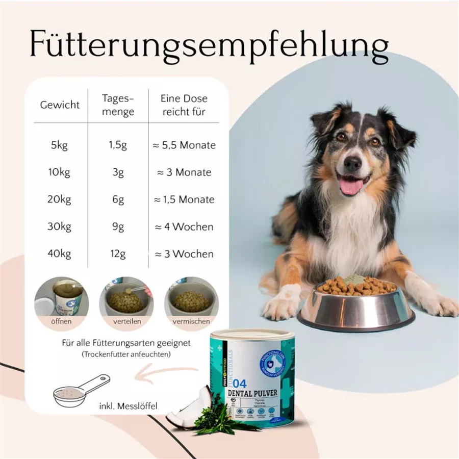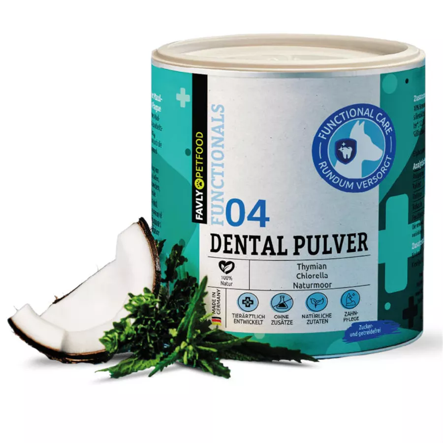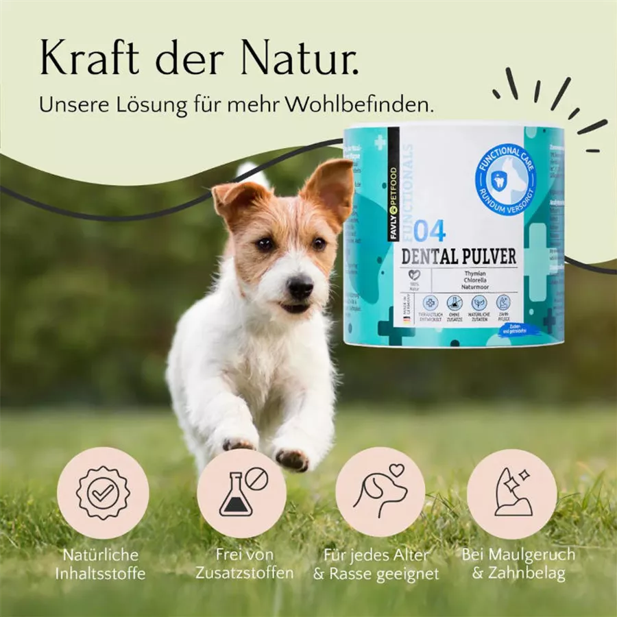 Das FAVLY Petfood DENTAL Pulver wurde speziell entwickelt, um die Zahngesundheit deines Hundes zu fördern, Maulgeruch zu reduzieren und die Bildung von Zahnbelag (Plaque) zu verhindern. Die hochwertige Pulvermischung besteht ausschließlich aus natürlichen Wirkstoffen – ohne Füllstoffe, getreidefrei und ohne Zusatzstoffe.