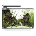 • Design-Aquarium mit sicherer LEDBeleuchtung mit 2 Lichtfarben, weißem und blauem Licht, das in 3 Stufen dimmbar ist.